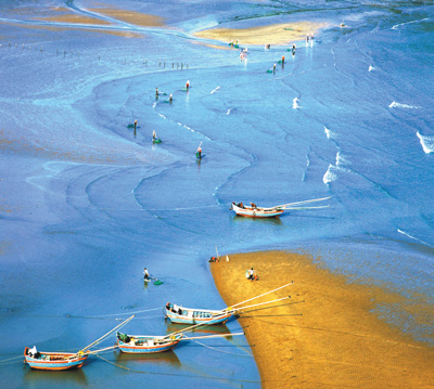 功夫不負(fù)有心人。經(jīng)過漫山遍野地毯式的尋覓,鄭德雄一行把霞浦海灘的拍攝點(diǎn)摸了個(gè)遍,也拍出了一幅幅漂亮的好作品。那照片上的霞浦真是美?。核{(lán)色的海水,金色的沙灘,種海帶的竹竿依序林立,滿載的漁船停泊在靜靜的港灣,趕海人背著沉甸甸的魚簍,正走在金色的沙灘上……