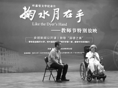 九月十日教師節(jié),南開大學(xué)舉辦《掬水月在手》影片首映式。葉嘉瑩先生是國際儒聯(lián)榮譽顧問,我銜命陪同王念寧副會長專程赴南開致賀,有幸在南開禮堂聆聽九十六歲高齡的迦陵先生與白巖松共話詩意人生。迦陵先生坐在輪椅上娓娓道來,鬢發(fā)皤然,聲如洪鐘,風(fēng)華絕代。