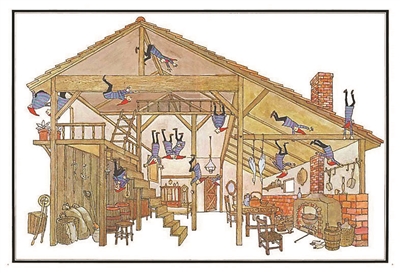 小時(shí)候的安野光雅常常把鏡子擺在地板或榻榻米上往里面看——在那個(gè)世界里,一切都被倒置了,“鏡子里出現(xiàn)了地下室,天花板變成了地板,燈泡直立在地板上。雖然知道那只是映像,但只要我愿意,地下室就能隨時(shí)出現(xiàn)在眼前”。安野光雅說(shuō),他迷戀在數(shù)學(xué)和哲學(xué)的領(lǐng)域中構(gòu)筑一個(gè)世界的感覺(jué), “那是一個(gè)立足于現(xiàn)實(shí)的虛擬世界,可以想象,如果虛構(gòu)成真,事情會(huì)如何發(fā)展”。