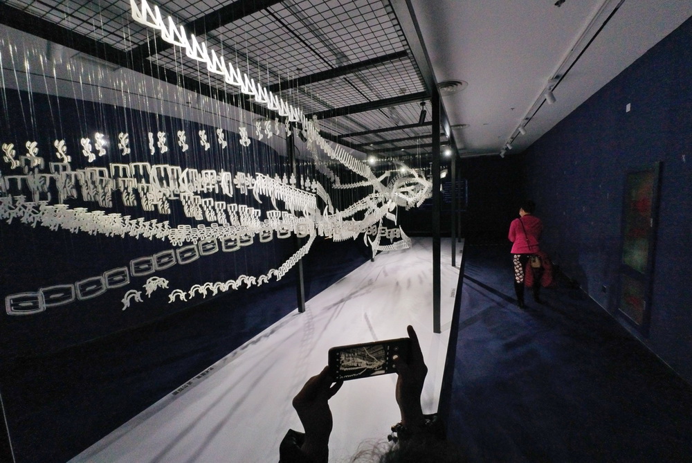2022年1月3日,天津國圖·津灣文創(chuàng)空間舉辦,甲骨文創(chuàng)意展,一名參觀者用手機拍攝甲骨文懸空雕塑。 中新社記者 佟郁 攝