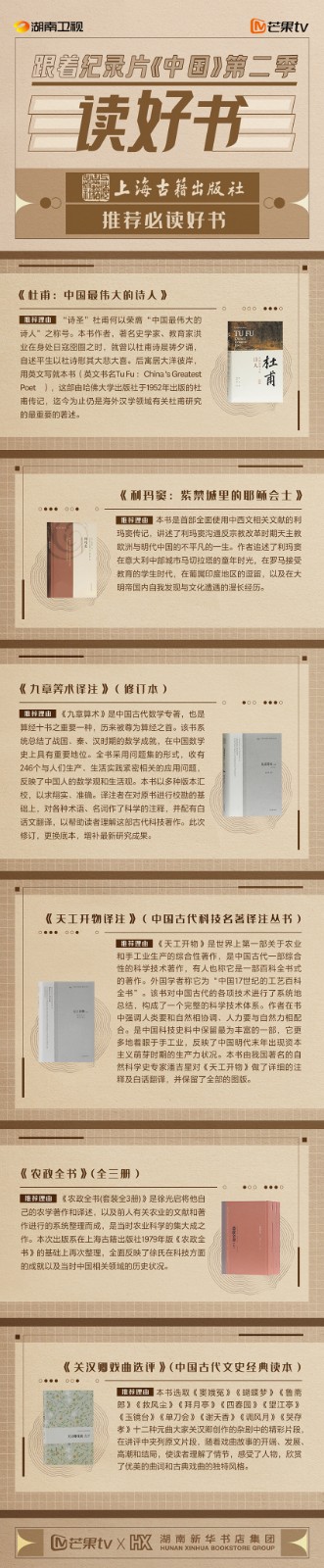 芒果TV以紀(jì)錄片《中國(guó)》第二季的精美品質(zhì),聯(lián)合湖南新華書(shū)店集團(tuán)的美譽(yù)口碑,將中華書(shū)局、上海古籍出版社、岳麓書(shū)社推薦的珍品好書(shū),傾情向大眾推薦。本次“跟著紀(jì)錄片《中國(guó)》第二季讀好書(shū)”活動(dòng),將從2月28日持續(xù)到3月15日,湖南新華書(shū)店集團(tuán)旗下湖南圖書(shū)城、不吝Boolink書(shū)店、全省市級(jí)中心門店、長(zhǎng)沙地區(qū)樂(lè)之書(shū)店等全員參與,推薦紀(jì)錄片《中國(guó)》第二季。書(shū)友及觀眾可登錄微博或到線下門店打卡參與活動(dòng)。