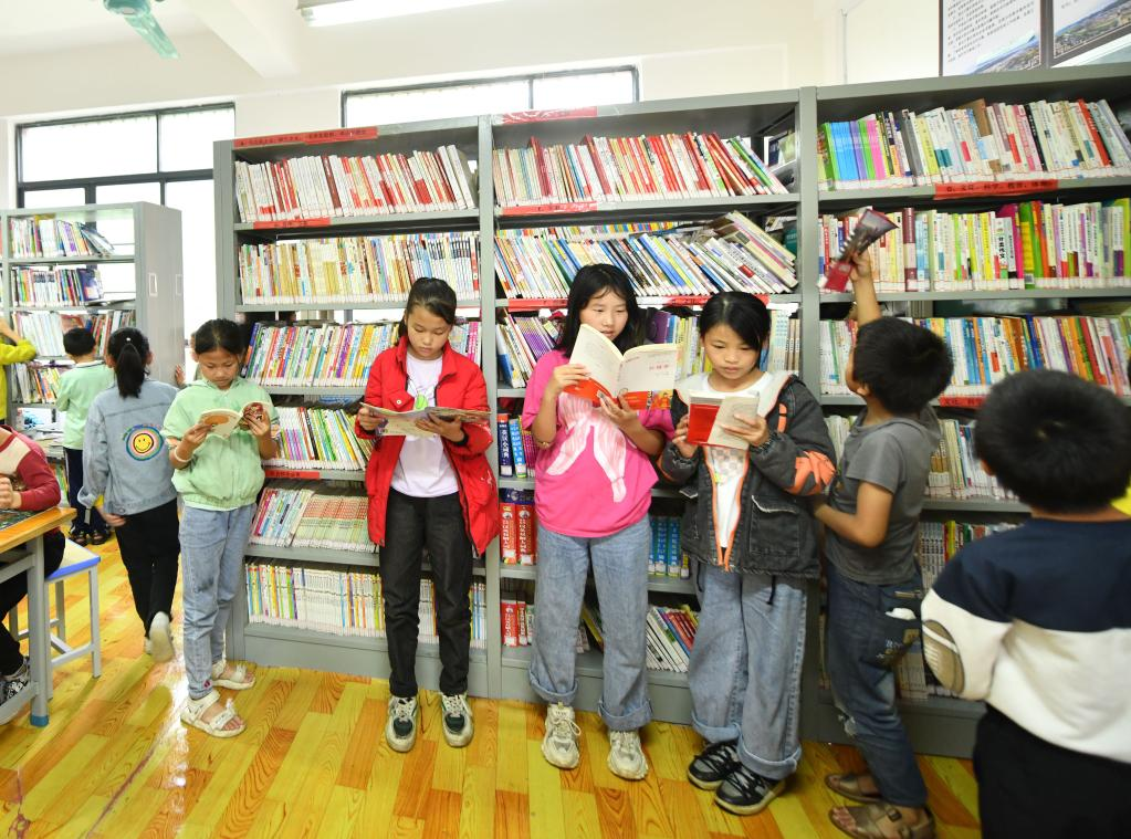骨龍村小學(xué)學(xué)生在圖書室閱讀(5月25日攝)。
