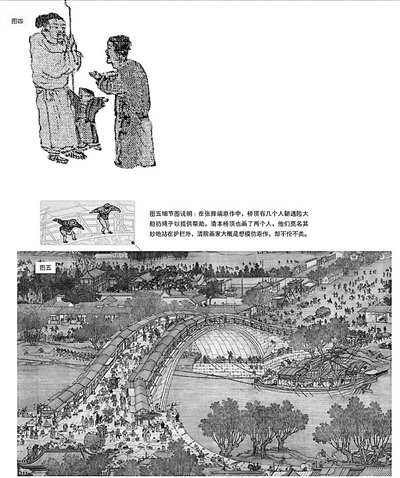《清明上河圖》在后世有兩種重要的仿本,一個(gè)是明代仇英款仿本,一個(gè)是清院本。在本文結(jié)束之前,我要以清院本中的虹橋?yàn)槔?,?lái)說(shuō)明仿本與張擇端原作的一個(gè)重要差別。請(qǐng)看圖五,那就是清院本中的虹橋,那橋梁雄偉壯大,氣勢(shì)如虹,是吧?再看船與橋的關(guān)系,船很大,但桅桿早就放下來(lái),完全可以順利通過(guò)。再看那些人物,他們小小的,就像螞蟻。他們像螞蟻,不是因?yàn)槲覀儼褕D縮得小,實(shí)際上,即使放大,也無(wú)法看出他們的個(gè)性、情緒,換句話說(shuō),這些人與其說(shuō)是人,不如說(shuō)是一些符號(hào)。把人符號(hào)化與賦予人物個(gè)性,這是仿本與原作的極大區(qū)別,也是我極力推崇原作的原因所在?!肚迕魃虾訄D》,我們就看到這里。(文并供圖/田玉彬)