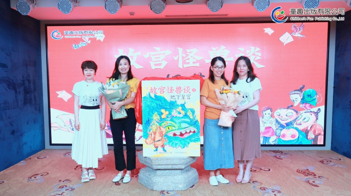 童趣出版有限公司總經(jīng)理史妍(左一)、作者常怡(左二)、插畫(huà)作者譚諾(左三)、童趣出版有限公司總編輯劉玉一(右一)為《故宮怪獸談》揭幕。