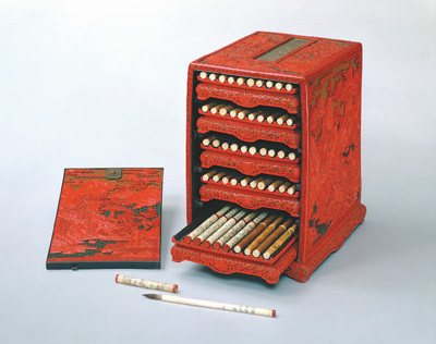 令人稱絕的還有乾隆御用的紫檀木旅行文具箱。這是一套箱裝形式的組合文具,按動機(jī)關(guān)并將木箱整體翻轉(zhuǎn)過來,便會轉(zhuǎn)化為一張高40厘米的書桌。箱內(nèi)置有布滿層、格、槽的盛物盒,用于盛放各種文房器物,包括琺瑯、漆器、玉器、瓷器等工藝精品,可謂一個移動的書房。