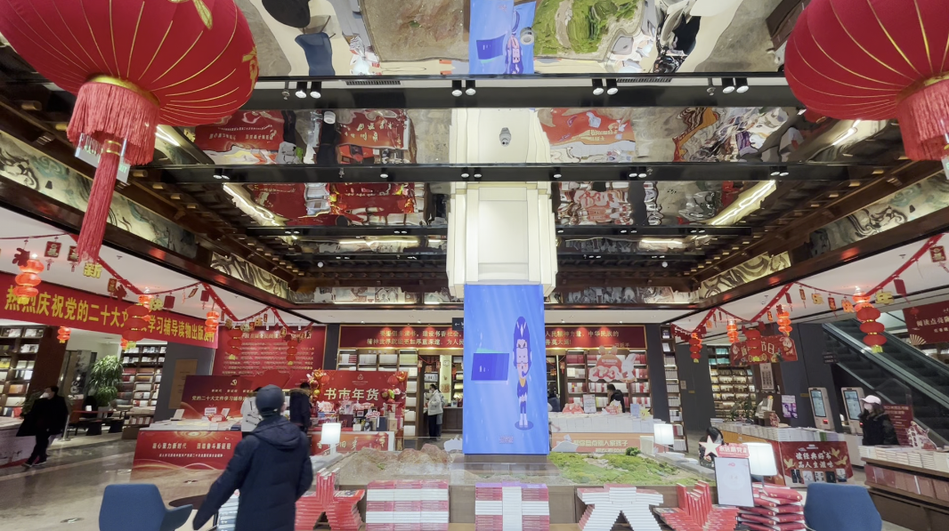 走進(jìn)甘肅省新華書店西北書城,這里裝扮一新,高高掛起的大紅燈籠烘托出濃濃的年味,敦煌文化元素的有機(jī)融入,讓中華優(yōu)秀傳統(tǒng)文化在這里流光溢彩。書城一樓的主題出版物展區(qū),勉勵人們熱愛讀書的標(biāo)語豁然醒目 。