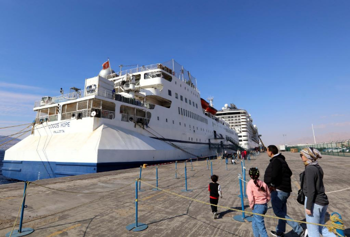 2月13日,在約旦亞喀巴港,人們前往“望道號”參觀。