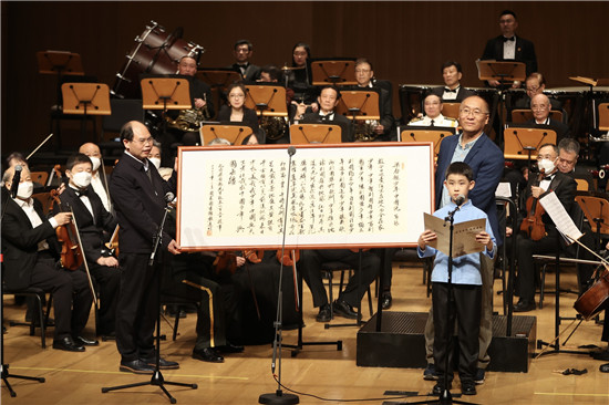 2月23日,北京,“前哲垂范 文津日新”——梁?jiǎn)⒊Q辰150周年紀(jì)念配樂(lè)朗誦音樂(lè)沙龍?jiān)趪?guó)家圖書(shū)館舉行。中國(guó)國(guó)家圖書(shū)館館長(zhǎng)熊遠(yuǎn)明(左)向梁?jiǎn)⒊笕速?zèng)手書(shū)《少年中國(guó)說(shuō)》。 蔣啟明/攝