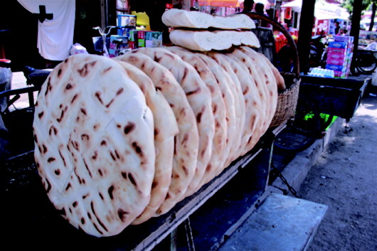 將面粉中加入一定比例的堿水,調(diào)和成面團揉入早發(fā)酵好的面團,然后再添入大量干面,接下來才是關(guān)鍵所在:用堅硬、光滑、沉重的木頭杠子一頭固定(形如杠桿),一頭人工操作,反復揉壓面團,直到將干面團壓成綢子一樣綿軟,再切成1斤、2斤或3斤的面劑子,搟成圓餅狀,抹上清油,撒上少許鹽和胡椒、苦豆、姜黃等佐料,最后將面餅卷起來,豎立壓制成團,再用木杠搟壓成厚而大的圓餅,并在上面用干凈的梳齒等工具精心旋出花紋圖案,抹少許清油,便可上鏊烘烤。
