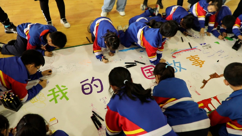 學(xué)生在繪本進(jìn)校園活動(dòng)中手繪畫布“我的中國故事”