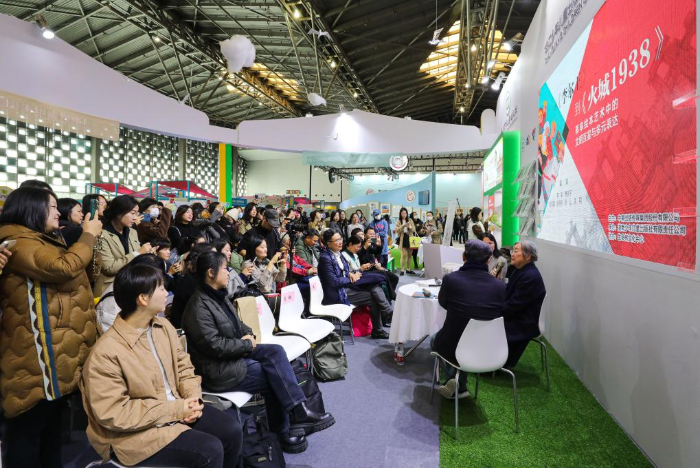 11月17日,藝術(shù)家蔡皋(右一)在第十屆中國(guó)上海國(guó)際童書展現(xiàn)場(chǎng)與書迷交流。