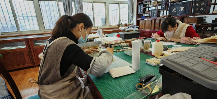 美術專業(yè)畢業(yè)的他對書籍裝幀尤為熱愛。他曾修復過一本嚴重脆化、狀若酥皮的明代古籍。為了加固修補,他采用“金鑲玉”的裝幀方式,用白色宣紙襯在折頁中,保護破損書葉。