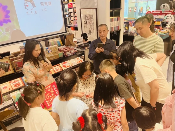北京航空航天大學(xué)新媒體藝術(shù)與設(shè)計(jì)學(xué)院教授顏新元為作者獻(xiàn)花,并與劉雪純、彎彎以及小朋友們一起為“彎彎工作室”揭幕。