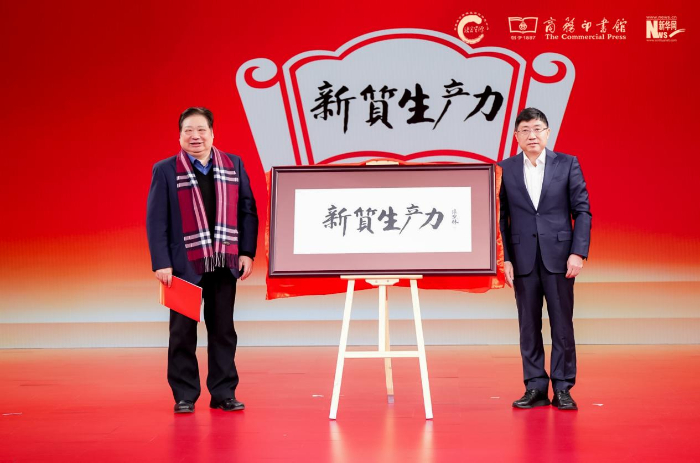 中國辭書學會會長、北京語言大學教授李宇明(左),中國出版集團有限公司副總經(jīng)理、黨組成員陳永剛(右)揭曉年度國內(nèi)詞“新質(zhì)生產(chǎn)力”。新華網(wǎng) 發(fā)