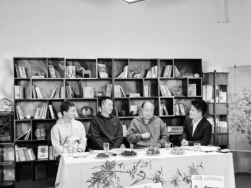 “在文學的曠野里”特別直播活動現(xiàn)場。從左至右為讀者張志方、《人民文學》主編施戰(zhàn)軍、作家莫言、“與輝同行”負責人董宇輝。 陳濤 攝