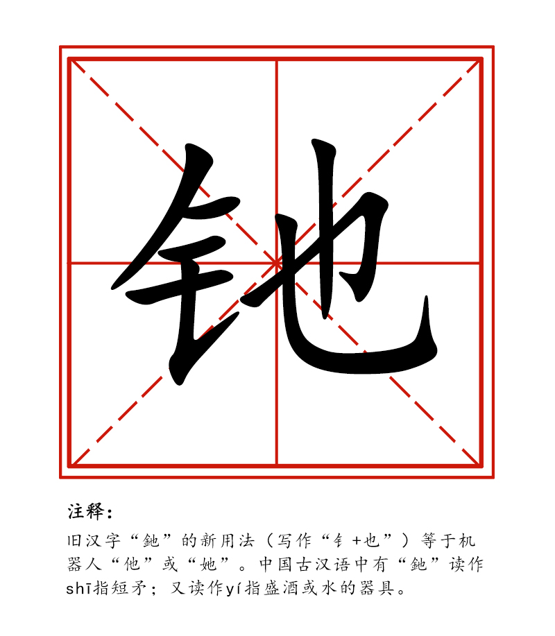中國(guó)甘肅網(wǎng)1月23日訊 近日,范鵬教授通過(guò)朋友圈為舊漢字“釶”發(fā)明了一種新用法,寫作“钅+也”,將其定義為等同于機(jī)器人的“他”或“她”。