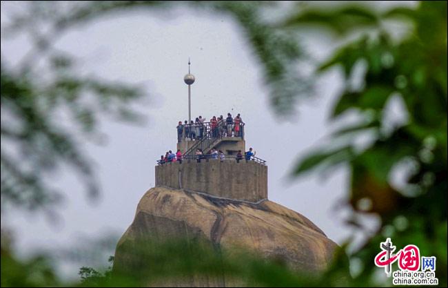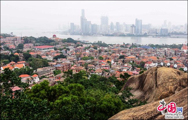 說(shuō)到自然風(fēng)光,便不能不提日光巖——這島上的最高峰。日光巖別名“晃巖”,相傳1641年,鄭成功來(lái)到此地,見(jiàn)此地風(fēng)景勝過(guò)吉林日光山,便把“晃”字拆開(kāi),稱(chēng)之為“日光巖”。要登臨此巖,一窺日光,便要辛勞走一段山路。其間渾圓的巨石層出不窮,蒼郁的古樹(shù)隨處可見(jiàn),更有閩南大厝、名人題字與這些自然風(fēng)景相得益彰。于是游人往往在心曠神怡中,路過(guò)“九夏生寒”“鷺江龍窟”,經(jīng)由“閩海雄風(fēng)”“古避暑洞”,不知不覺(jué)間,來(lái)到巖頂?shù)钠脚_(tái)。立定此處,憑欄遠(yuǎn)望,只見(jiàn)輕靈的云天近在咫尺,島上的屋宇盡收眼簾——別提有多么愜意!難怪有詩(shī)人寫(xiě)道:“一葉輕舟破霧霾,波濤滾滾此登臺(tái)。日光巖上憑欄望,隔岸清風(fēng)過(guò)海來(lái)。”(陳仁德句)