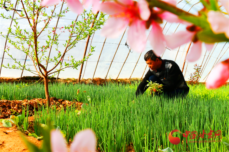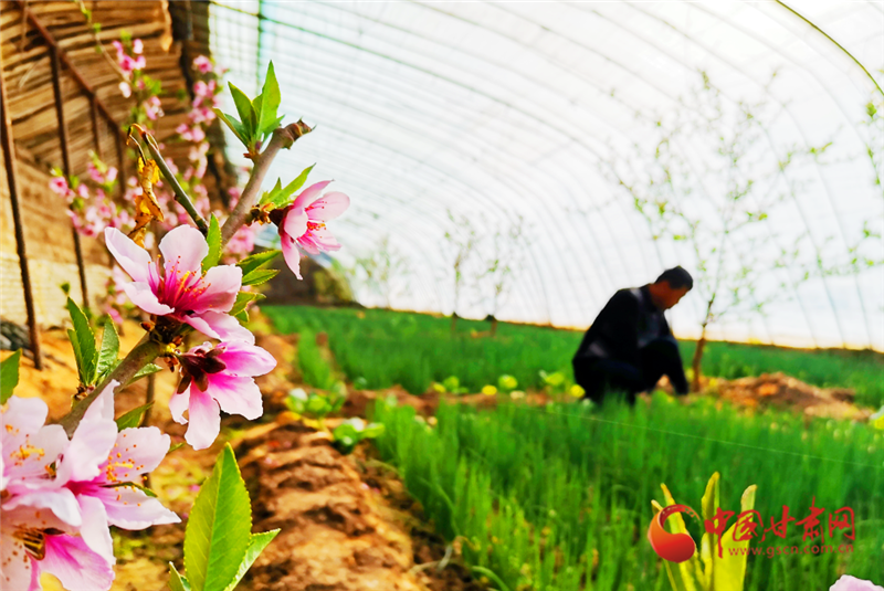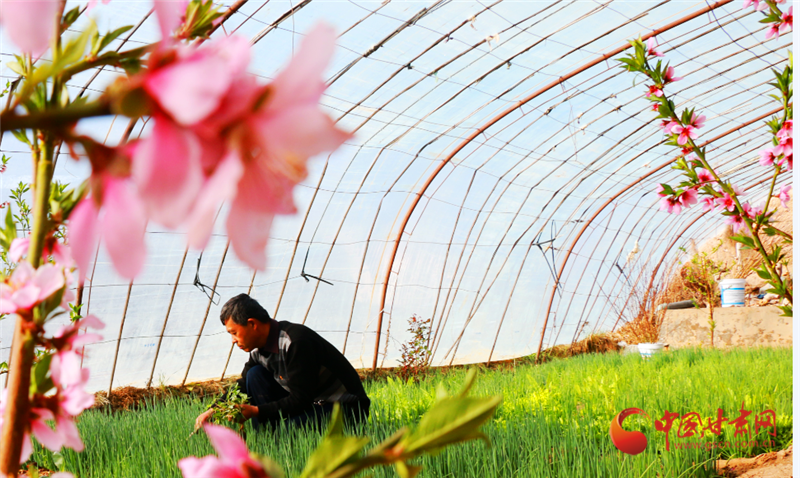 走進敦煌市月牙泉鎮(zhèn)現(xiàn)代采摘園區(qū)農(nóng)民陶寶憲的溫室大棚,粉紅的桃花開得正艷,濃濃春意撲面而來,在花香的陪伴下,陶寶憲在大棚中辛勤勞作。