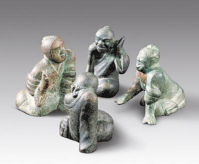 20世紀90年代甘肅靈臺縣出土了一組西漢銅質(zhì)博戲俑。俑最高9.2厘米,最寬9.7厘米。四俑相向跪坐,身著高領(lǐng)長服。其中二人頭挽發(fā)髻,二人以寬巾裹頭。坐姿不同,形態(tài)各異,有的前傾仰首,有的垂臂塌肩;有的袒胸露膊,似在伸手探?。挥械那刃鄙?,默然扶膝靜坐。四俑的面部表情不同,刻畫細膩。他們或喜笑顏開,或嚴肅面對,或凝神沉思,或略顯悲愁,神態(tài)活現(xiàn),精彩逼真,具有高超的藝術(shù)性和研究價值。
