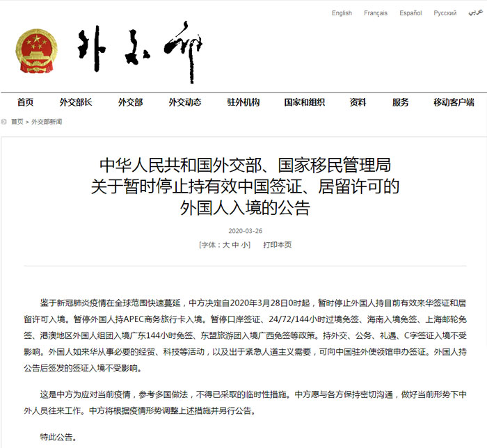 3月26日,中華人民共和國外交部、國家移民管理局發(fā)布《關(guān)于暫時(shí)停止持有效中國簽證、居留許可的外國人入境的公告》(以下簡稱《公告》),決定28日起,暫時(shí)停止外國人持目前有效來華簽證和居留許可入境。