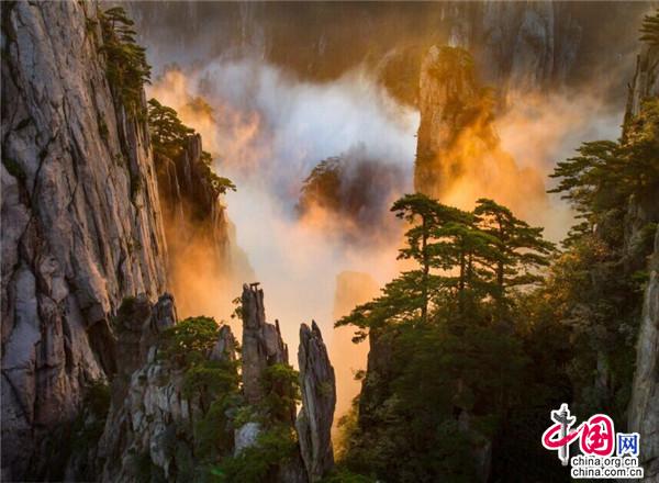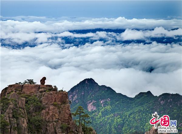 云海是黃山美景的精髓與靈魂所在,如上帝的神來之筆,賦予了黃山深邃含蓄的意境。黃山植被覆蓋率高,溫潤的水汽常年縈繞,跟著風游走,或聚或散,或濃或淡。云衫映幽山,薄霧罩峰巒,疑似仙境銀河墜落人間。