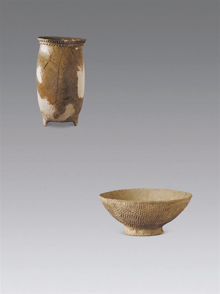 甘肅省博物館收藏的另外兩件同為大地灣文化的彩陶器皿,分別是:“繩紋深腹罐”“繩紋圈足紅陶碗”。