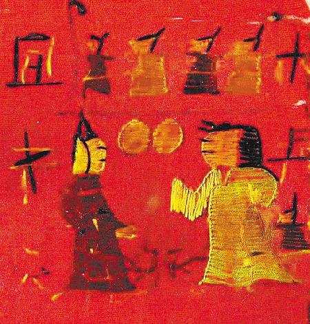 武威磨嘴子72號(hào)漢墓出土一塊絹底刺繡人物圖,上繪吏人,頭戴尖頂幘,身穿窄袖緊身衣。1972年武威磨嘴子4號(hào)墓、23號(hào)墓和25號(hào)墓共出土了三件蓋在棺板上的絲織銘旌,上面繪有日月蟾蜍圖像,日中有三足鳥(niǎo),月中有玉兔。武威磨嘴子一號(hào)墓出土廣山錦三塊??椃邦伾嗤?,是墓主人的覆面及覆蓋物。棕色底,黃、褐、白三色顯花。在變體云紋之間,織有青龍、白虎,作相對(duì)奔走狀。在龍、虎紋中間織“廣”“山”二字。此外,還有織錦衣領(lǐng)邊飾帶一條,為上衣領(lǐng)口邊飾。黃地,淡黃、褐、橘黃、石藍(lán)顯花,斜經(jīng)組織。上下間以長(zhǎng)方格對(duì)稱(chēng)隔離,內(nèi)用淡黃、褐色織出龍虎等圖案,中間夾織橘黃、石藍(lán)色間隔的長(zhǎng)形條帶。這些文物都是甘肅紡織畫(huà)的代表作。