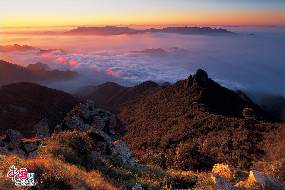 當(dāng)北京的第一縷陽光從這里升起。站在海拔2118米的頂峰平臺上,遙望東方,天際中開始露出幾抹灰色的浮云,隨后不斷地升騰、擴(kuò)大,繼而天邊漸紅,紅色越來越深,范圍越來越大,曙光漸露,丹霞輝映,把整個東方都變成濃濃的紅色。山峰在云霧中時隱時現(xiàn),彩云在天際間變幻,有時像奔馳的駿馬,有時像仙女飄逸,有時像玉樹瓊宮……千姿百態(tài),遐想無窮。猛然,比紅色的彩云更火紅、更光亮、更鮮艷的太陽露出了一條邊弧,緩緩上升。四周的云霧似乎忍受不了她那光茫的照射而淡化、隱退,太陽則很快掙脫了云霧與夜色的纏繞,迅速地上升,躍出天邊。霎時,一輪紅日噴薄而出,金光四射,霞光瑞氣,照徹天宇,山巒、萬樹沐浴著朝陽的金輝,令人眼花繚亂。舉目四望,朝霞映照下的霧靈山,群峰起伏,云霧如海,波濤洶涌,九曲十八彎的旅游公路似戲水游龍,在峰巒間若隱若現(xiàn)。