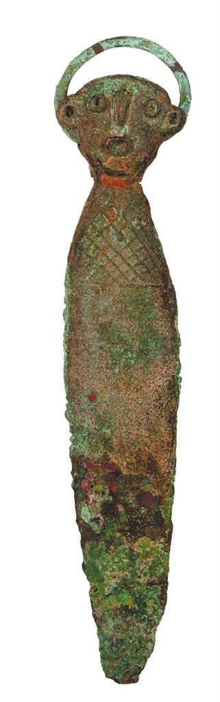 相比刀與叉,匕的出現(xiàn)要稍晚一些,甘肅省博物館收藏有人頭柄銅匕兩把,都是辛店文化(距今3400年—2800年)的產(chǎn)物,兩把人頭柄銅匕都采集于甘肅省廣河縣。一把人頭柄銅匕造型比較拙樸,匕身平直呈長舌狀,末端為圓弧形并微上翹。柄首為人頭形,高鼻,圓眼,厚唇微張,半環(huán)形雙耳,一耳殘缺。另一把人首柄銅匕同前一把人頭柄銅匕造型相似,但做工卻要精美許多,這把銅匕柄首也是人頭形,高鼻,圓眼,圓口,雙耳為半環(huán)形,頸部涂紅色,身體為方格網(wǎng)紋。這把人頭柄的人面雙目圓睜,嘴微張,一副機靈驚詫的表情,比前一把人頭柄銅匕人面憨直質樸的面目更有意趣。這是兩把還沒成為武器的銅匕,但它已經(jīng)有了勺子的雛形。