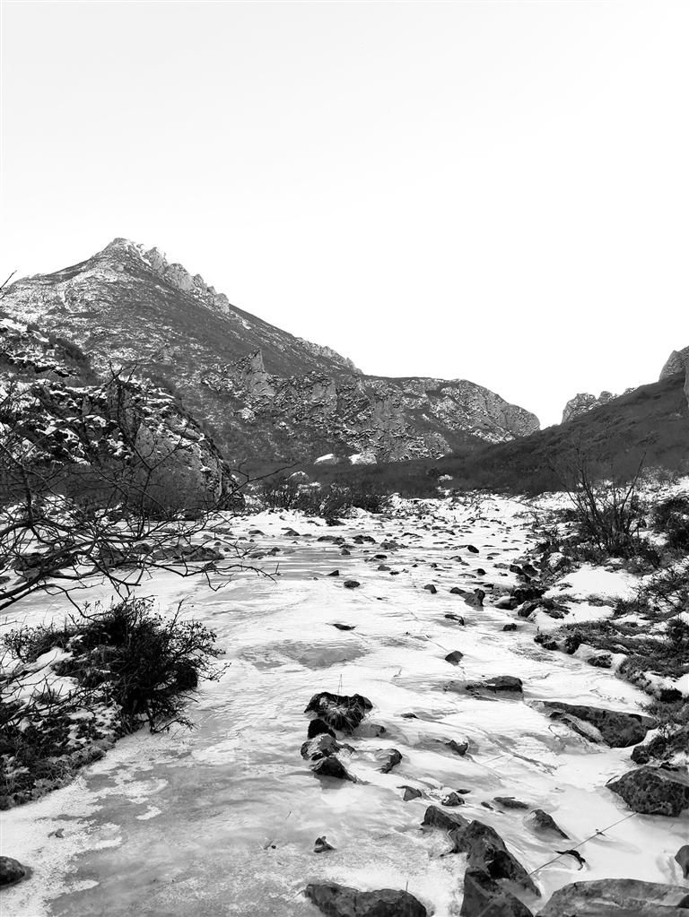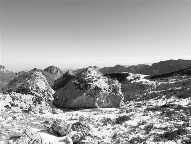 穿過(guò)公路就來(lái)到露骨山腳下,山間灌木叢生,枯葉凋零,一夜的小雪也使天空更加清澈。上山的路,總體是溯溪而上,不過(guò)腳下的小溪已經(jīng)變成冰河,但潺潺水聲不時(shí)在耳邊響起,大小石塊橫亙?cè)诒又?,白雪覆蓋其間,我們一行沿著前人在雪地留下的腳印,撥開齊胸的灌木枝,深一腳淺一腳、兜兜轉(zhuǎn)轉(zhuǎn)向前行。