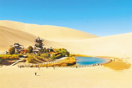 鳴沙山月牙泉是敦煌諸多自然景觀中的佼佼者,古往今來(lái)以“沙漠奇觀”著稱于世,被譽(yù)為“塞外風(fēng)光之一絕”。月牙泉、莫高窟九層樓和莫高窟藝術(shù)景觀融為一體,是敦煌城南一脈相連的“三大奇跡”,成為中國(guó)乃至世界人民向往的旅游勝地。