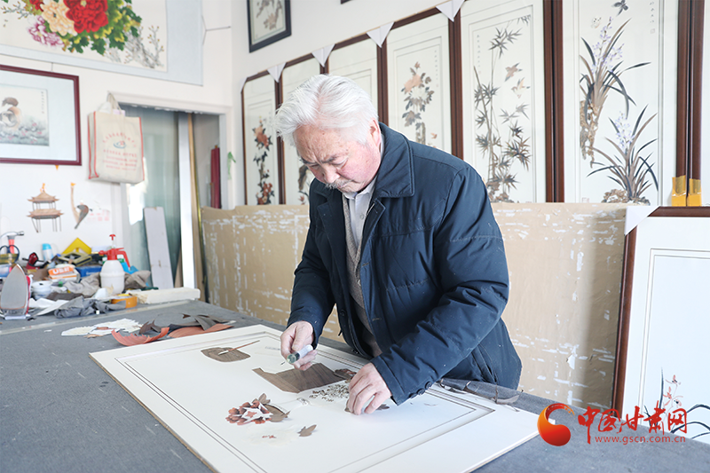 民樂縣宮燈制作代表王秀娥正在繡制孔雀手工藝品