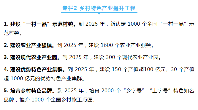 ——鄉(xiāng)村特色產(chǎn)業(yè)深度拓展。培育一批產(chǎn)值超百億元、千億元優(yōu)勢特色產(chǎn)業(yè)集群,建設(shè)一批產(chǎn)值超十億元農(nóng)業(yè)產(chǎn)業(yè)鎮(zhèn)(鄉(xiāng)),創(chuàng)響一批“鄉(xiāng)字號”“土字號”鄉(xiāng)土品牌。