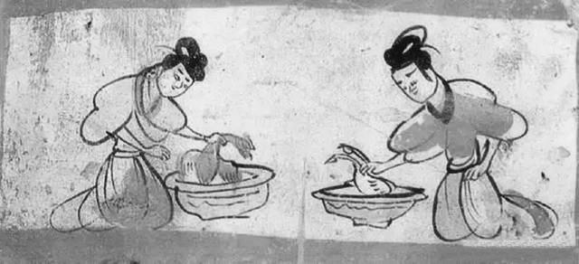 燙雞圖壁畫(huà)磚就出土于5號(hào)墓葬,這是繪制在一塊單塊磚面上的壁畫(huà),磚面上用刷得甚薄的含膠白堊土作底,正中繪制二婢相對(duì)跪坐,袖子高高挽起,眉毛微撇,聚精會(huì)神地在各自的盆內(nèi)燙雞去毛。左邊盆內(nèi)雞有冠,為公雞形象;右邊盆內(nèi)雞無(wú)冠,似為母雞形象。用色較為單純,以墨、赭石和朱為主。畫(huà)面寥寥數(shù)筆,將婢女勞動(dòng)的情況表現(xiàn)得淋漓盡致,極具生活趣味。尤其是雞脖子被抓住的樣子非常傳神, 生動(dòng)地表現(xiàn)出寫(xiě)實(shí)的情境。我們從中可以看到,1600多年前的人們殺雞處理食材,跟現(xiàn)在我們殺雞燙毛毫無(wú)二致。