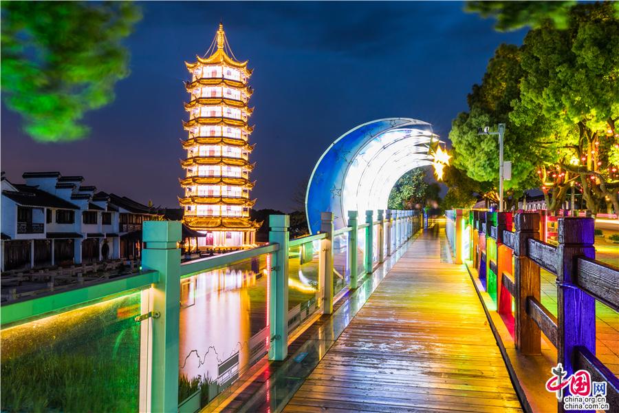 周莊大橋下,圓月與云海塔交相輝映;全福長(zhǎng)橋橫臥于南湖上,高懸于空的圓月獨(dú)擁蒼穹。共賞圓月,再現(xiàn)“春江花月夜”之景。