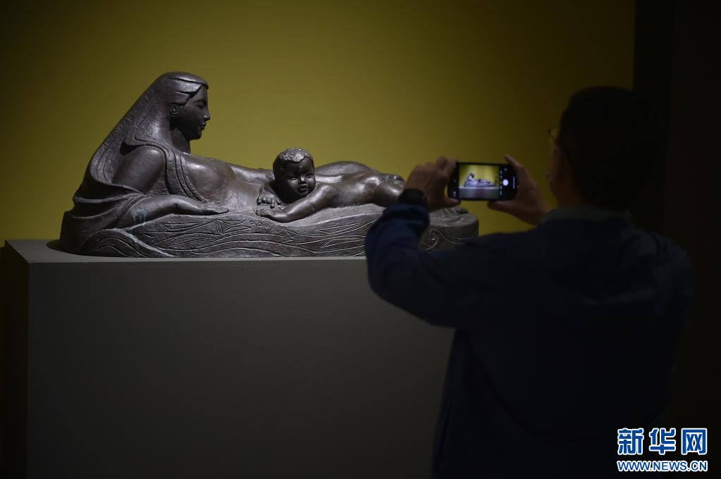 8月14日,參觀者在中國美術(shù)館拍攝展出作品《黃河母親》。 新華社記者 魯鵬 攝