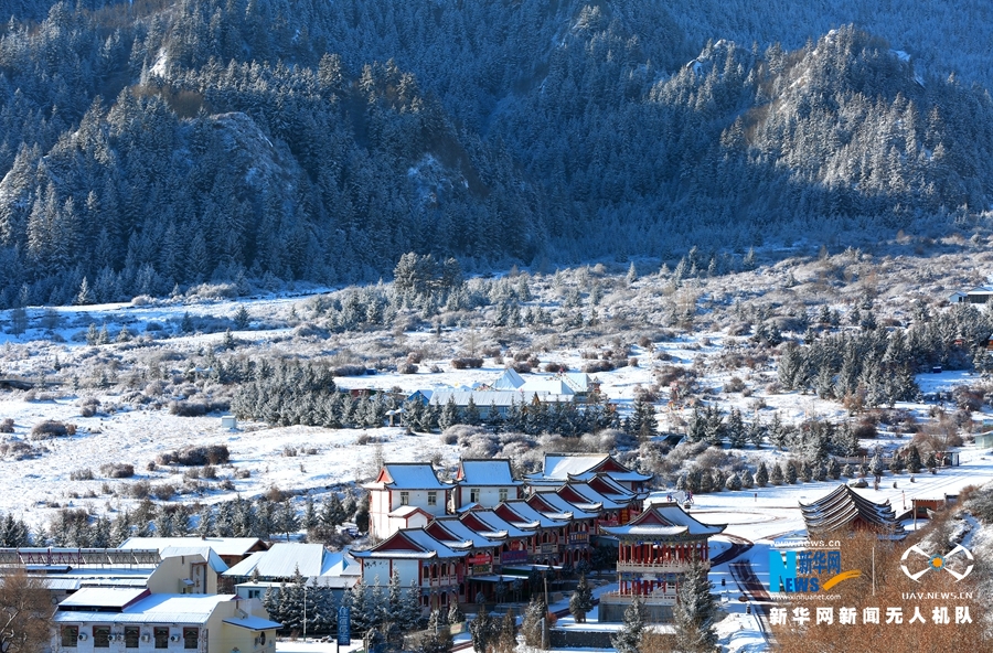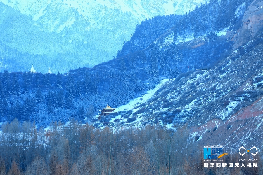 這是11月21日航拍的甘肅省張掖市肅南裕固族自治縣馬蹄寺風景區(qū)雪景。新華網(wǎng)發(fā)(楊永偉 攝)