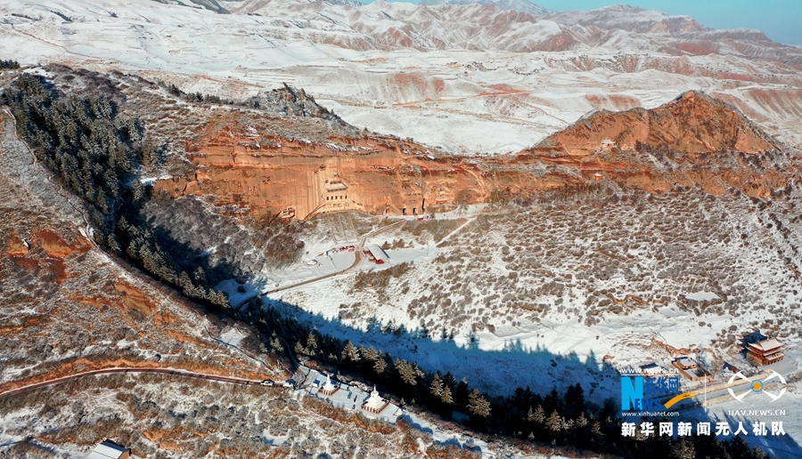 當日,雪霽初晴的甘肅省張掖市肅南裕固族自治縣馬蹄寺風景區(qū),松海翠柏銀裝素裹,與丹霞峭壁上的石窟相互映襯,如一幅美麗畫卷。