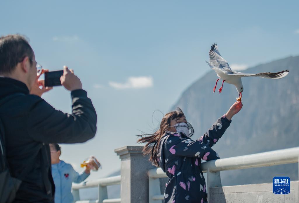 1月23日,小朋友在昆明市滇池海埂大壩投喂紅嘴鷗。