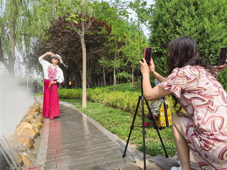 “一枝獨(dú)秀”團(tuán)隊(duì)的王大姐和姐妹們帶著專屬攝影師正在這里攝影留念。王大姐告訴記者,這是她們今年第2次來(lái)這里打卡。“這里的花真美,每年我們都會(huì)來(lái),拍照發(fā)在網(wǎng)上,收獲無(wú)數(shù)點(diǎn)贊,心情別提多美了。”說(shuō)話間,姐妹們又?jǐn)[了幾個(gè)造型,攝影師按下快門,精準(zhǔn)捕捉唯美瞬間。“4公里外的寓言故事園最近也特別火,過(guò)兩天我們就去打卡。”王大姐說(shuō)。