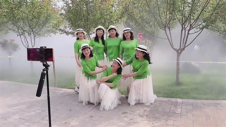 上午9時(shí)30分,水池中漸漸漫出淡淡的煙霧,時(shí)而稀薄,時(shí)而濃厚,隨著陣陣微風(fēng)飄蕩在小橋流水間。“準(zhǔn)備放音樂(lè),我在原地來(lái)回轉(zhuǎn),你用手機(jī)豎屏拍。”……記者穿梭于人群間,這樣的聲音不絕于耳。“姐妹花”龔大姐和田大姐身穿正裝,各自圍上了顏色艷麗的圍巾,正站在鏡頭前直播。“這里非常美,像仙境一樣。綠化也做得特別好,公園里的綠植和鮮花種類繁多,很好看。我們是第一次來(lái),希望蘭州多打造一些這樣的美景。”