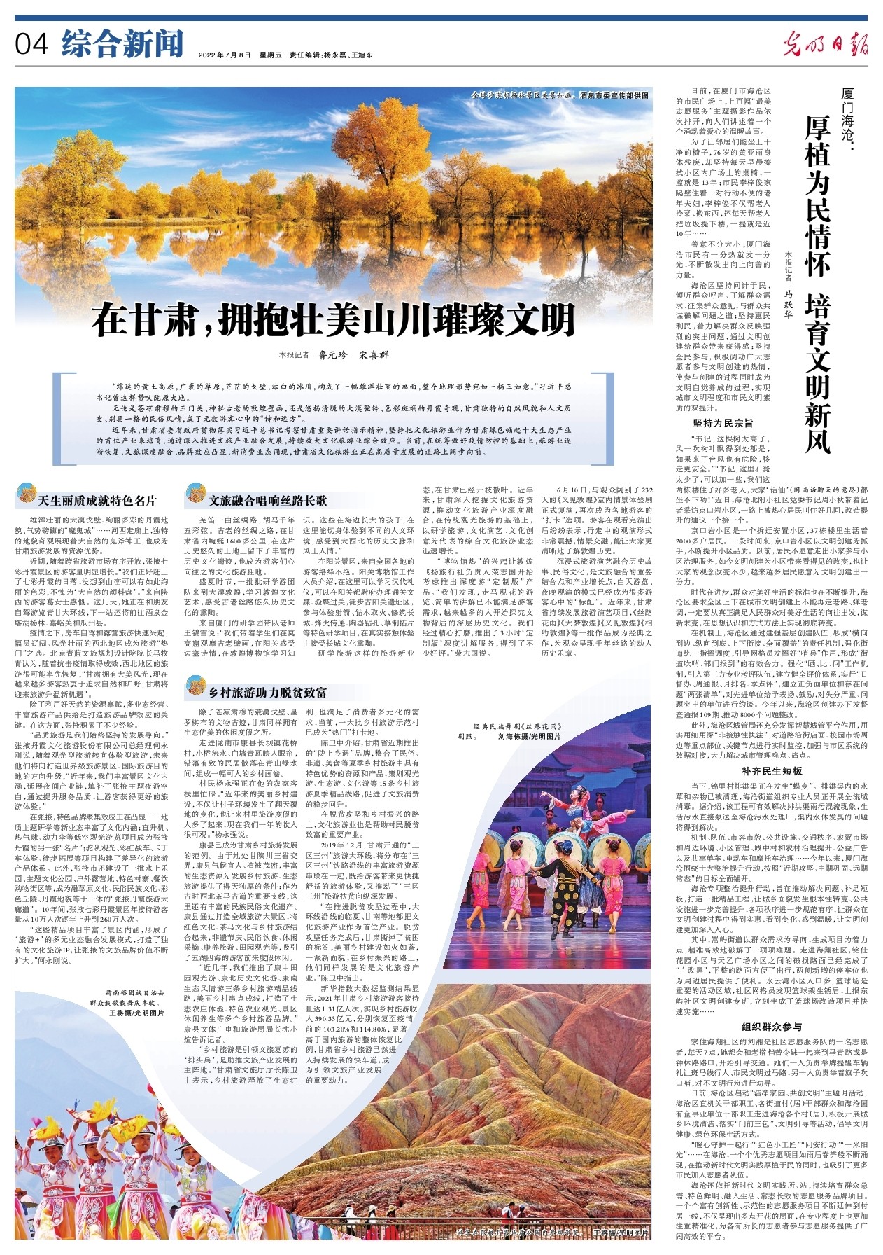 “品質(zhì)旅游是我們始終堅(jiān)持的發(fā)展導(dǎo)向。”張掖丹霞文化旅游股份有限公司總經(jīng)理何永剛說,隨著觀光型旅游轉(zhuǎn)向體驗(yàn)型旅游,未來他們將向打造世界級(jí)旅游景區(qū)、國(guó)際旅游目的地的方向升級(jí),“近年來,我們豐富景區(qū)文化內(nèi)涵,延展夜間產(chǎn)業(yè)鏈,填補(bǔ)了張掖主題夜游空白,通過提升服務(wù)品質(zhì),讓游客獲得更好的旅游體驗(yàn)。”