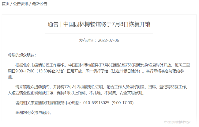 中國園林博物館發(fā)布最新消息,根據(jù)北京市疫情防控工作要求,中國園林博物館7月8日起按照75%限流比例恢復(fù)對外開放。