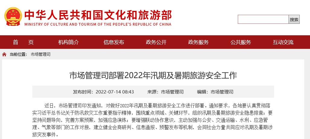 據(jù)文旅部網(wǎng)站消息,近日,文旅部市場管理司印發(fā)通知,對做好2022年汛期及暑期旅游安全工作進行部署。