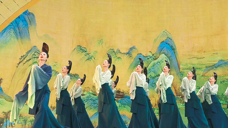 圖為圍繞傳世名作《千里江山圖》創(chuàng)排的舞蹈詩劇《只此青綠》亮相2022年中央廣播電視總臺春節(jié)聯(lián)歡晚會(視頻截圖)?!≈醒霃V播電視總臺供圖