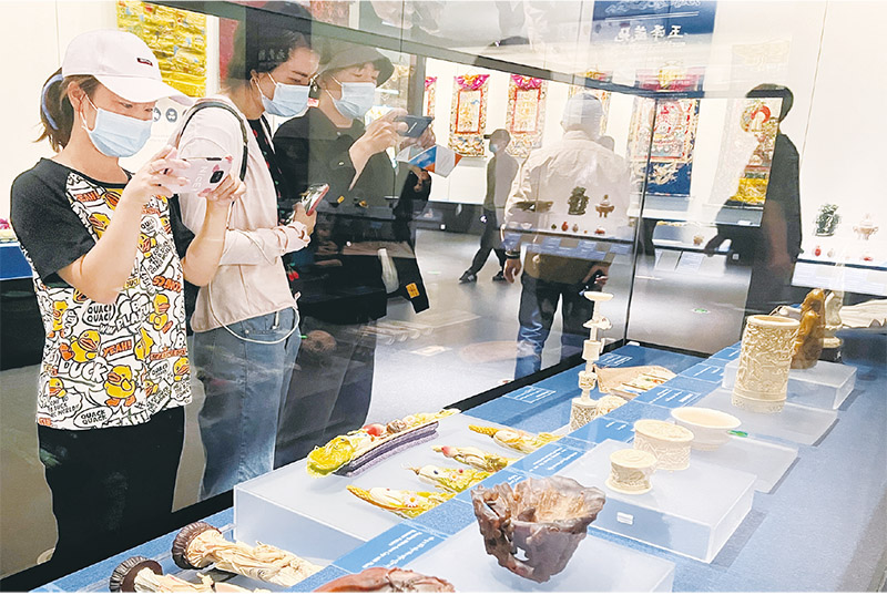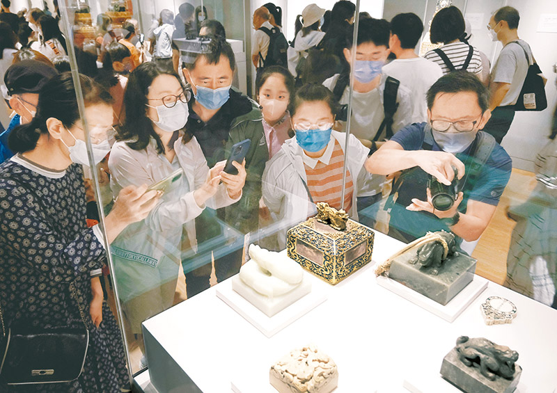 2022年7月3日,香港故宮文化博物館正式對公眾開放參觀。圖為觀眾在香港故宮文化博物館展廳內(nèi)參觀拍照?!⌒氯A社記者 王申/攝