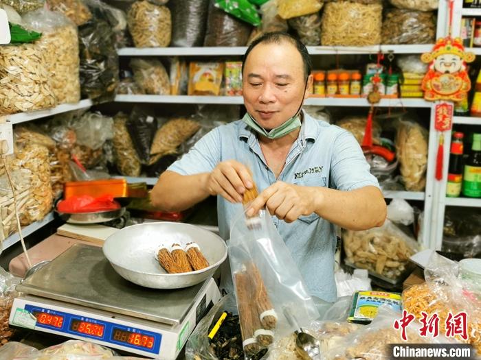 資料圖為廣東臺山富城市場內(nèi),一藥材檔的老板為顧客用密實袋打包參絲。 中新社發(fā) 李曉春 攝