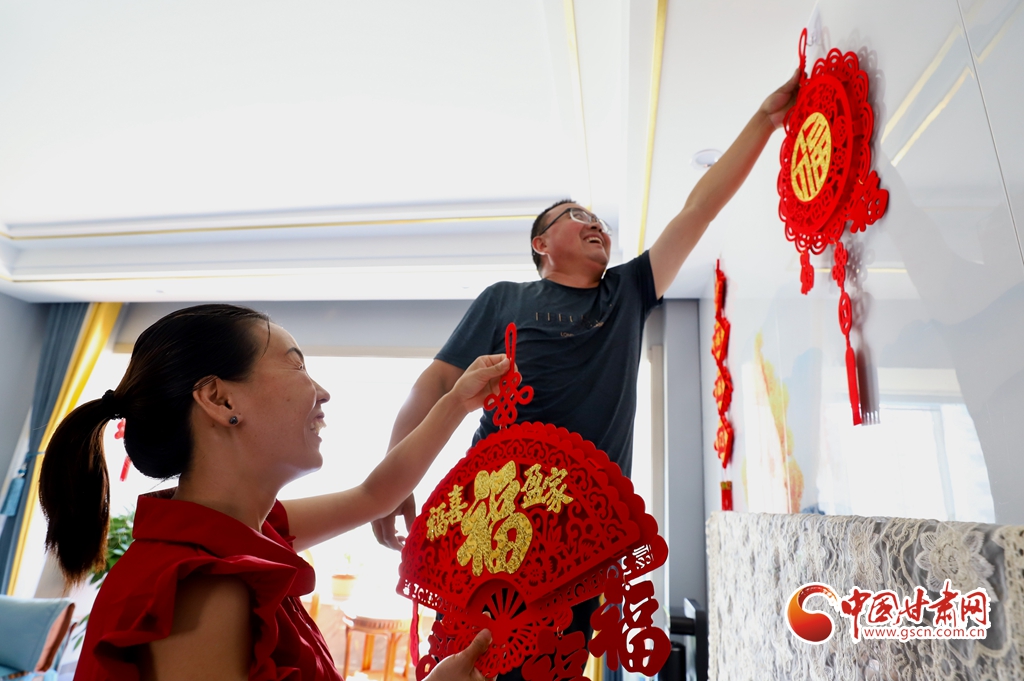 8月30日,張掖市民樂縣搬遷到樂民新城新居的一家人正在墻上掛福字。