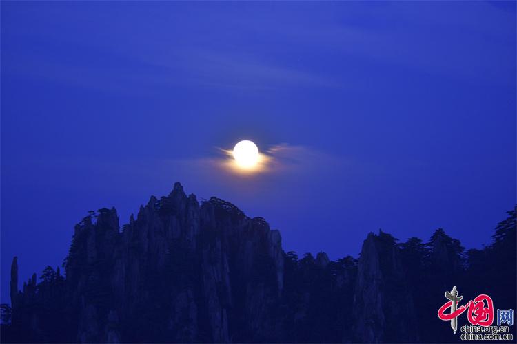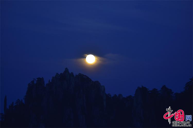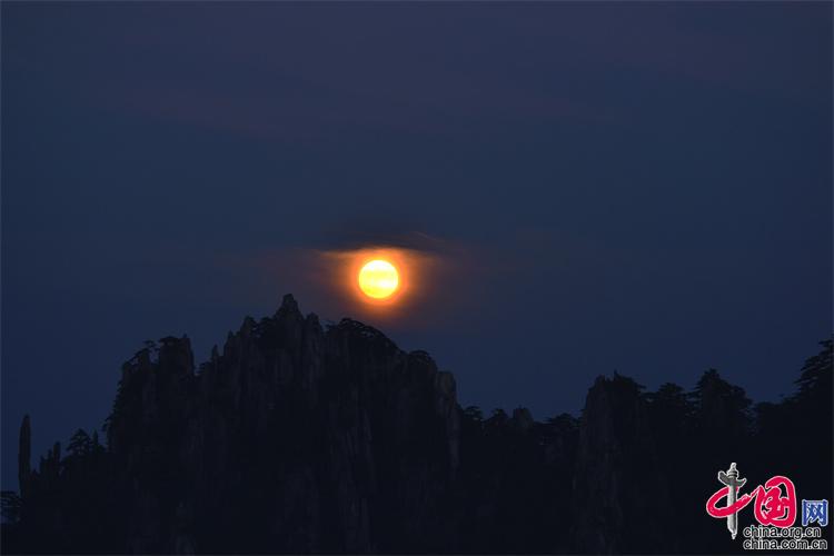 9月10日,中秋之夜,7點(diǎn)左右月亮如約而至,躍出地平線,穿過(guò)群峰峻嶺,露出了它靚麗的臉龐。剛出的時(shí)候,月亮和初升的太一樣是帶紅色的,隨著慢慢的升起越來(lái)越明亮,這時(shí)的黃山在月光照射下變得很清新。(姚育青)