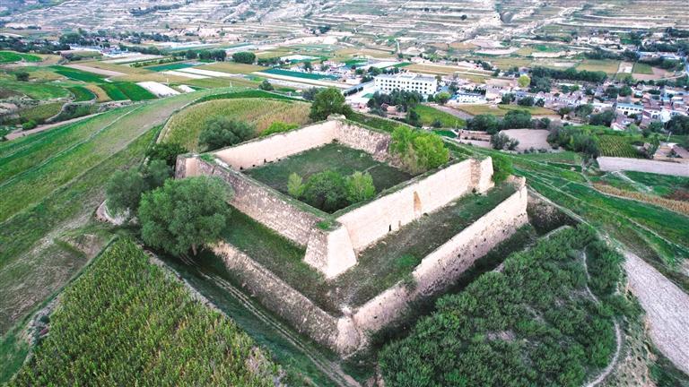 漫步騾子灘,附近的水家坡堡子也值得一去。這個(gè)堡子呈正方形,占地超4畝,不管從哪個(gè)視角看,都稱得上震撼。堡子分上下兩層,下層高5米、寬5米、邊長55米,上層高6米、底部厚3.5米、頂部厚2米、邊長35.5米。堡子外圍修有一圈寬5米、深6米、總長230余米的壕溝,曾為護(hù)城河。堡子約建于1946-1948年間,用來辦公和防御戰(zhàn)爭。1949年8月,解放軍在水家坡地界圍剿國民黨馬步芳部隊(duì),經(jīng)過一天一夜戰(zhàn)斗,馬步芳部隊(duì)潰敗逃往新營方向,當(dāng)時(shí)有一發(fā)炮彈落在堡子一角,至今炮坑清晰可見。